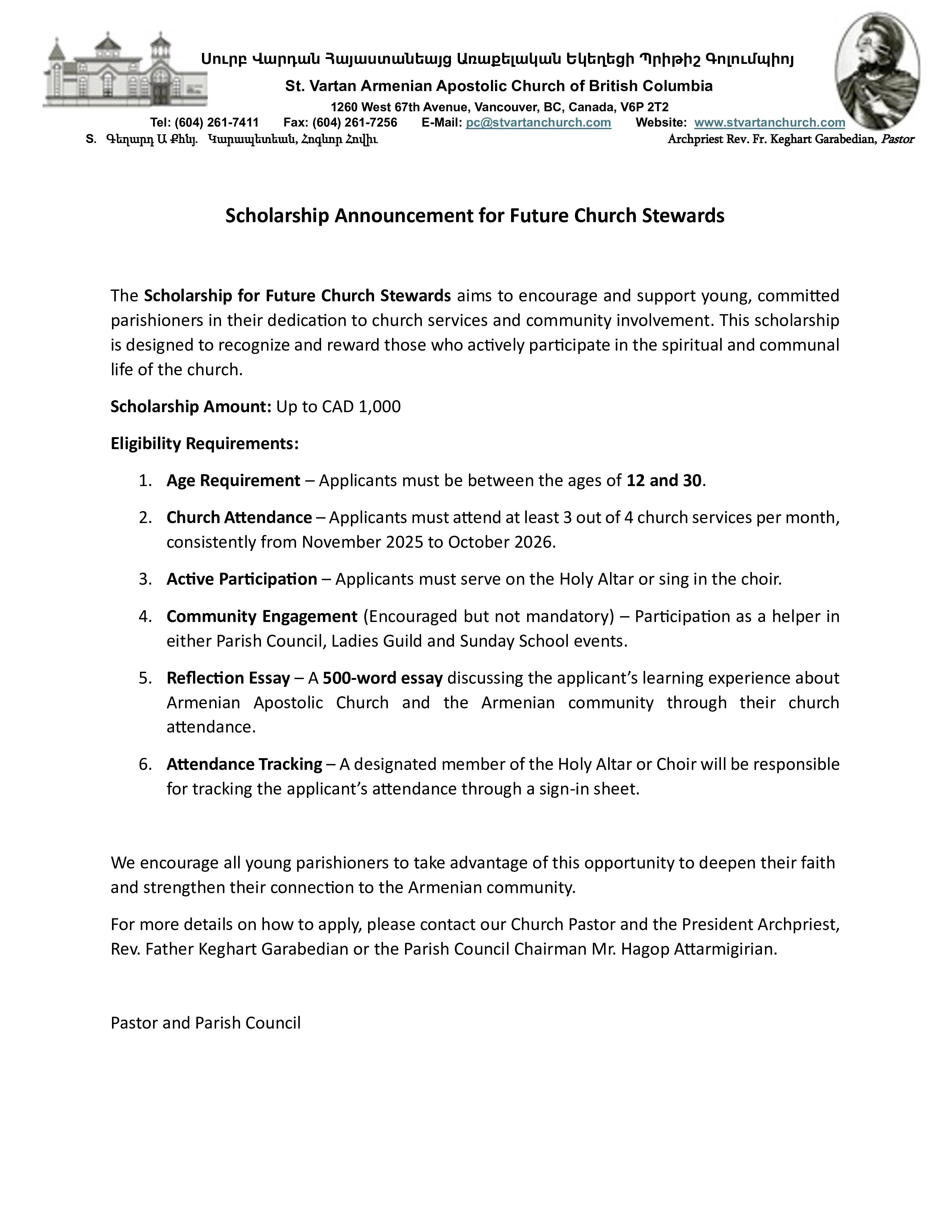 - Երեքշաբթի, Յունուար 6, 2026, կէսօրուայ ժամը 12։00ին Աստուածյայտնութեան Սուրբ Պատարագ և Ջրօրհնէք։