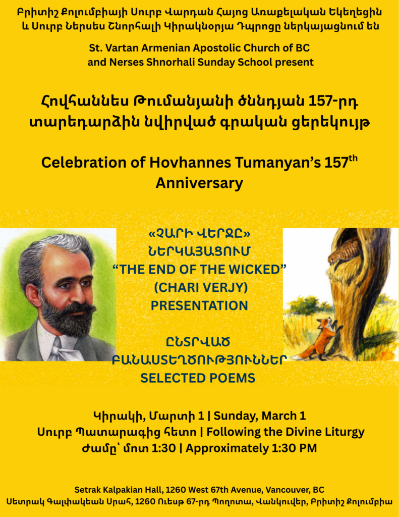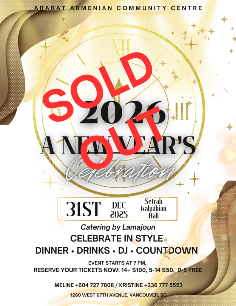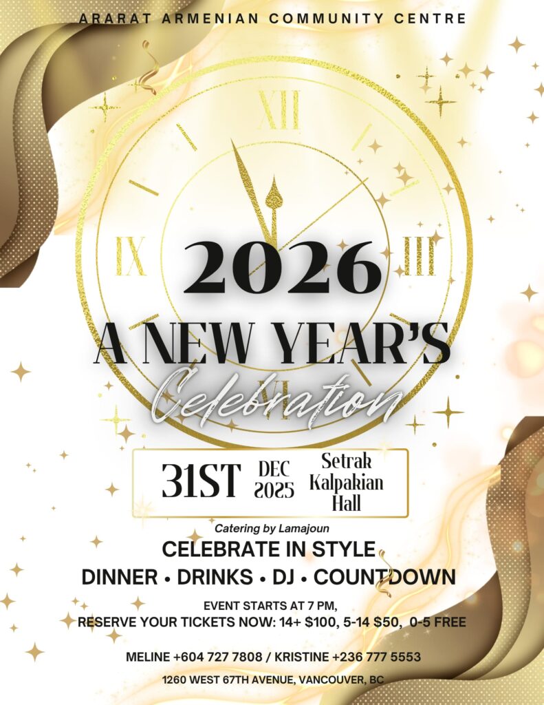 - Կիրակի, Յունուար 11, 2026, կէսօրուայ ժամը 11։00ին Սուրբ Պատարագէն ետք Սուրբ Ծննդեան և Աստուածյայտնութեան տօնին առիթով ճաշկերույթ “Սեդրակ Գալփակեան” սրահում՝ կազմակերպուած Տիկնանց Միութեան կողմէ։